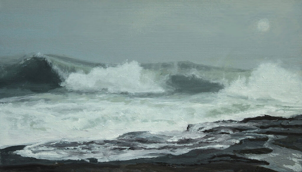 JUDY BELASCO Foggy Mood Schoodic oil on panel, 8.75 x 5 inches $950